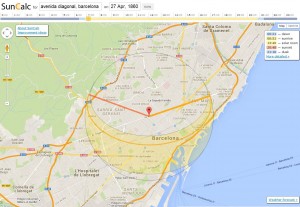 Lo mejor es verlo con un ejemplo. Os dejo este enlace donde podéis comprobarlo: http://suncalc.net/#/41.3969,2.1616,13/2015.04.27/ Para poderlo comprobar bien hay que introducir en el mapa 27 de abril, de 1860, hora 7 de la mañana, que es cuando salió el Sol en esa fecha. 1860 es el año en que comenzó el Plan Cerdà. Y lo mismo con el 15 de agosto de 1860. También se han de introducir las coordenadas de la avenida Diagonal de Barcelona. Y el resultado es cuando menos bien curioso.